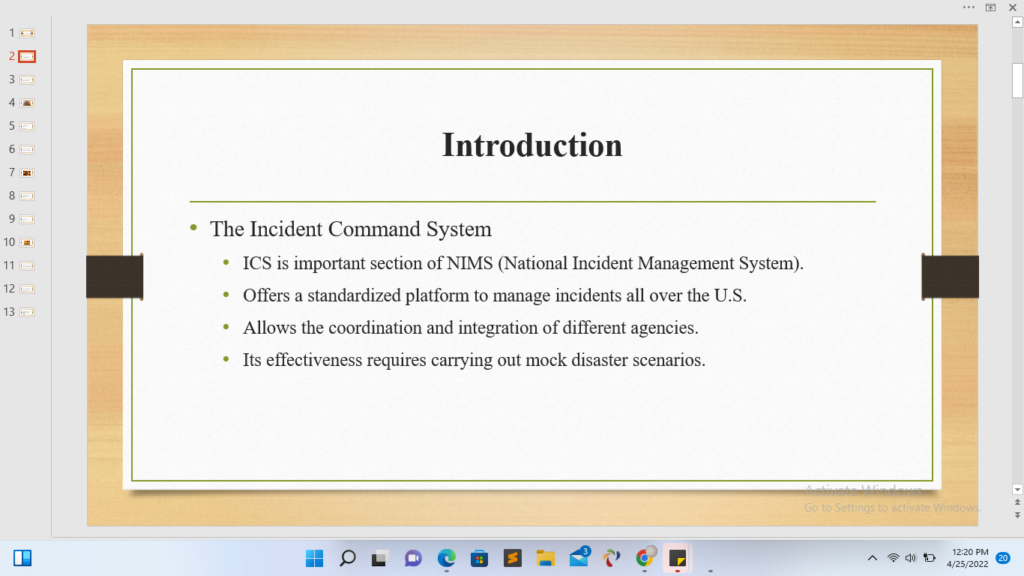 Develop a response plan for a mock incident involving a facility or location in your community. This is a single incident of your choosing, such as a fire, active shooter, natural disaster, etc. We are looking for you to simulate an incident response and use your project as an opportunity to demonstrate what you have learned about the incident command process during the course. The PowerPoint presentation should contain the following slides: