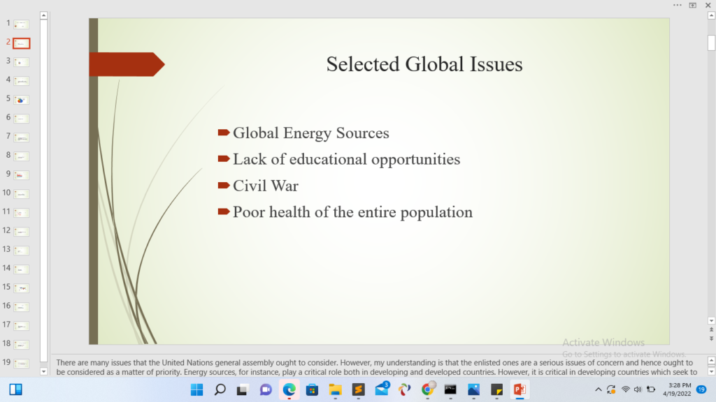A paragraph in the notes section to explain how the details you have provided in the slide is pertinent to the UN’s discussion on selecting and prioritizing goals.