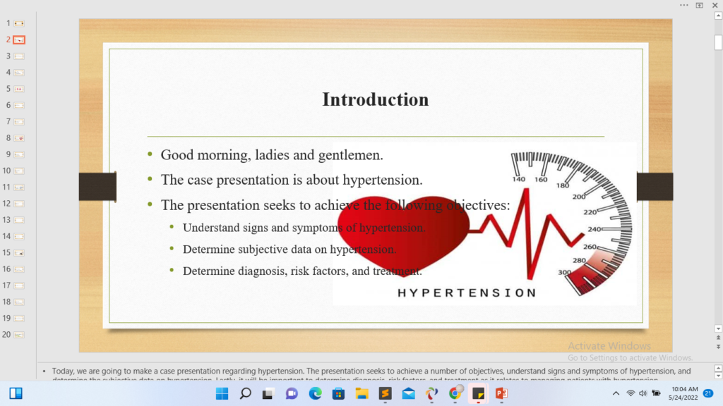 Create a case presentation with PowerPoint slides related to a clinical encounter that you assessed during the practicum. Your completed presentation must contain at least 15 slides and the presentation itself should span 15 – 20 minutes.