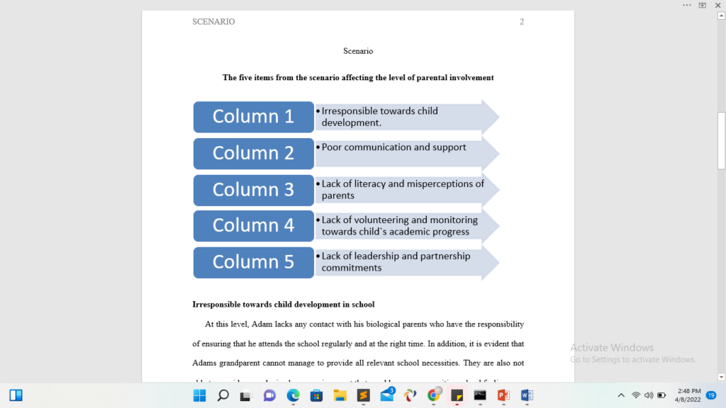 Essay : Describe five items from the scenario affecting the level of parental involvement.