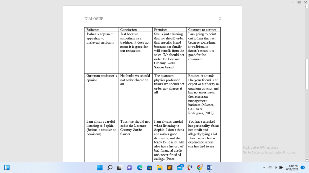 Using the unit five template, review for dialogue (short conversation) between three people. Identify for fallacies, along with the four premises and conclusions leading up to the policies identified. In the first, Identify the fallacy present. in the second column, identify the conclusion of the fallacious agreement, and in the third column identify the premises, or the reasons offered for the conclusion. In the last column propose some ways to counter this fallacy. You should have total of four fallacies, four conclusions, four premises before counters to correct the father sees. Our fallacies must come from chapter 8 of our textbook.